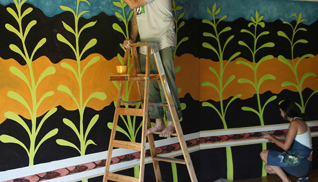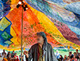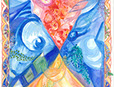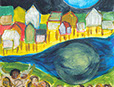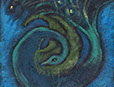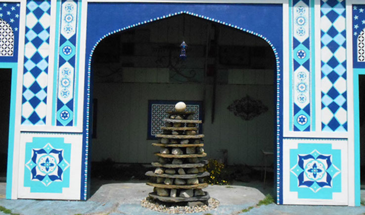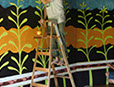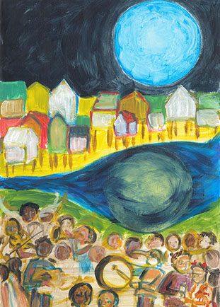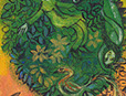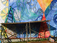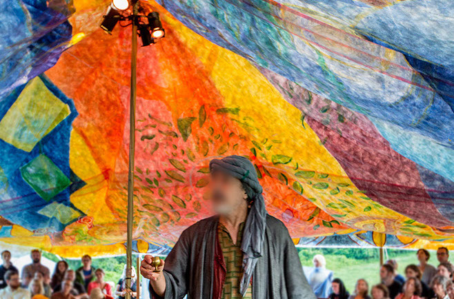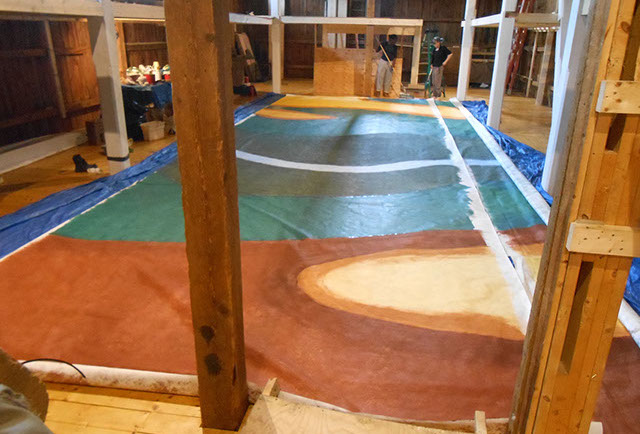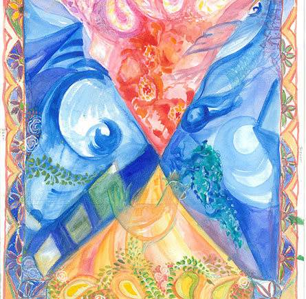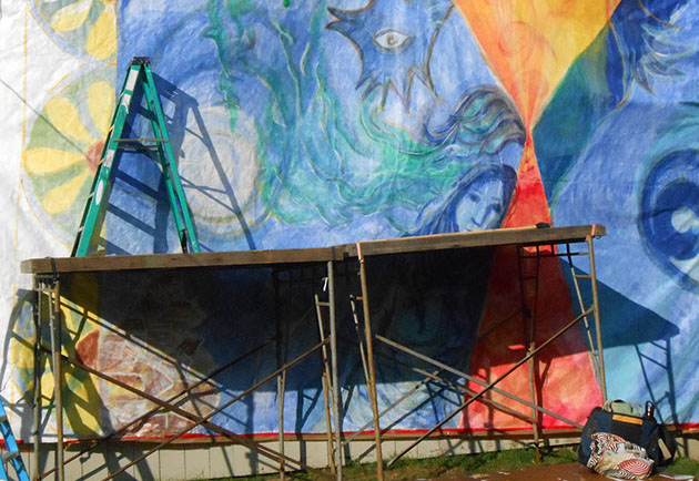 I worked as an artist-collaborator and design team member at Double Edge Theatre in Ashfield, Massachusetts from 2008-2016. My first work with the ensemble was the design and creation of puppets for the play the Disappearance (written by Ilan Stavans) in 2008. After that my main work was large-scale painting for summer outdoor performances: Arabian Nights (2009), The Firebird (2010), The Odyssey (2011 and 2012), Shahrazad (2013 and 2014) and Once a Blue Moon (2015 and 2016). For all of the large scale work pictured here, my design partner and painting team co-leader was Rachel Silverman, art educator at Mohawk Trail Regional School in Buckland. Rachel and I also painted, in tandem, the small watercolor version of the Shahrazad tent ceiling.